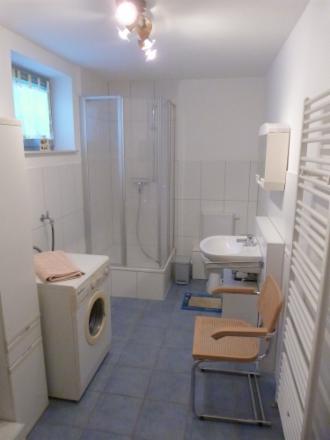 Badezimmer mit Dusche, WC, Waschbecken, Waschmaschine, Handtüchern