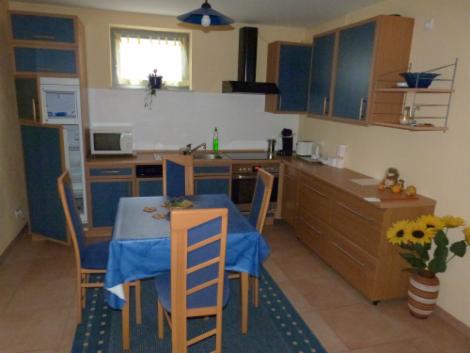 Küche komplett eingerichtet mit Spülmaschine, Mikrowelle, Kühl-Gefrierkombination, Herd mit Backofen